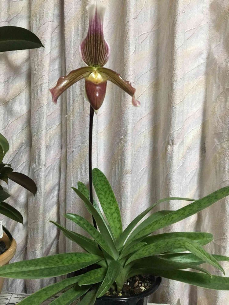 🍃🍃🍃お店でパフィオペティラムが手招きしてました。🧐🧐🧐よく見ると支柱が無くて風が当たると揺れてます。🤐🤐🤐持ち帰る時も車🚗に揺られブラブラ🌾🌾🌾…耐えて到着❗️❗️