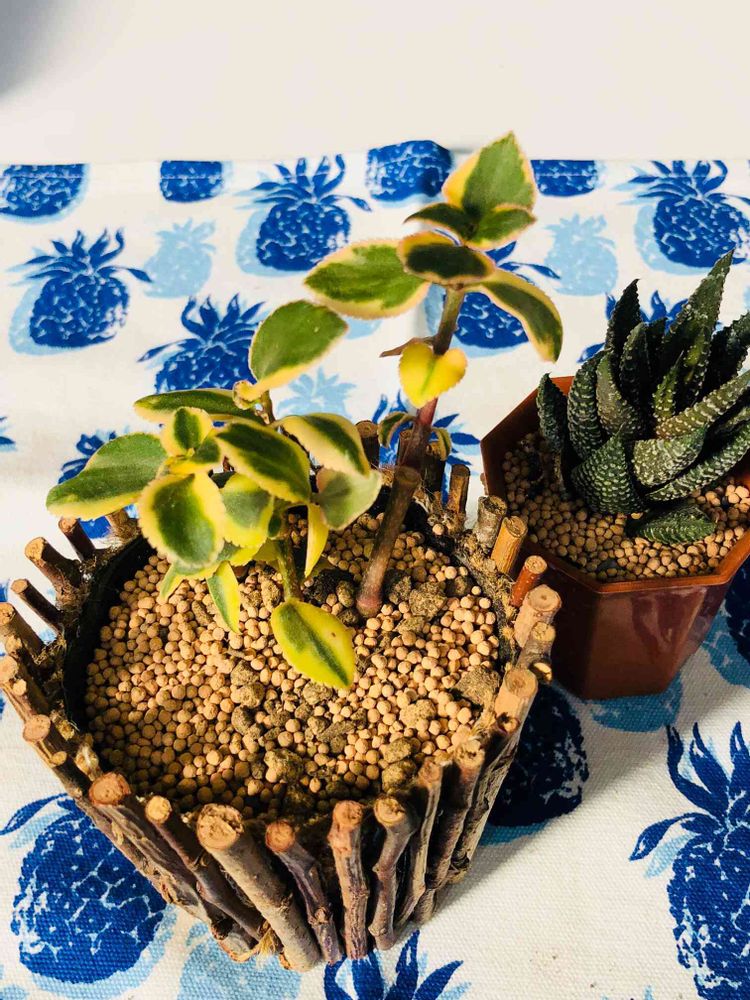 サルメントサです。多肉さんコーナーで見つけました。斑入りが好きなのでつい(^_^;)。てっぺんの周りがすこ〜しピンクになってるんですよ😊💕今見たら中断に小さい芽も出ていました🌱💕✊右はなんと三代目です😑⤵️どうも水が足りなすぎたのか、カイガラムシにもやられましたけど、風通しと水量今度こそ😭って感じです。