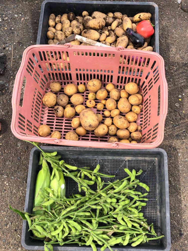 じゃがいも🥔ととうもろこし🌽は最後の収穫です。ナス🍆トマト🍅は最盛期、枝豆はこれから最盛期を迎えます。