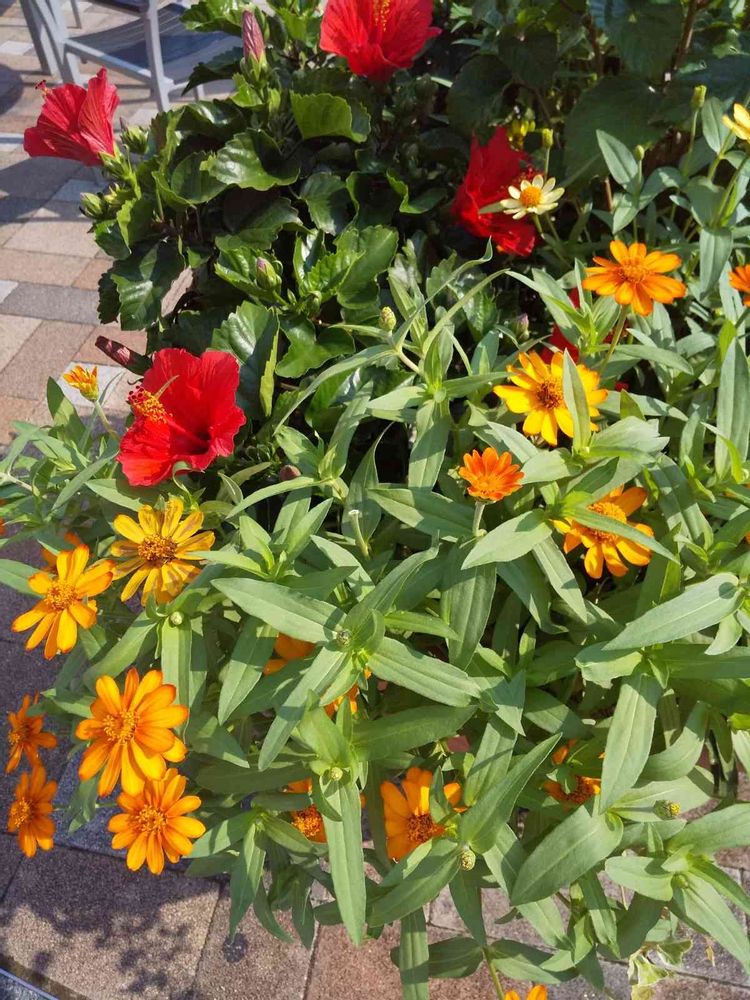 赤いハイビスカスとジニアさん…たち…仲良く咲いてました…🌺🧡🌿🥀🌺🧡🌺🧡🌿🥀🌺🧡🌺🧡💚🤗❣️