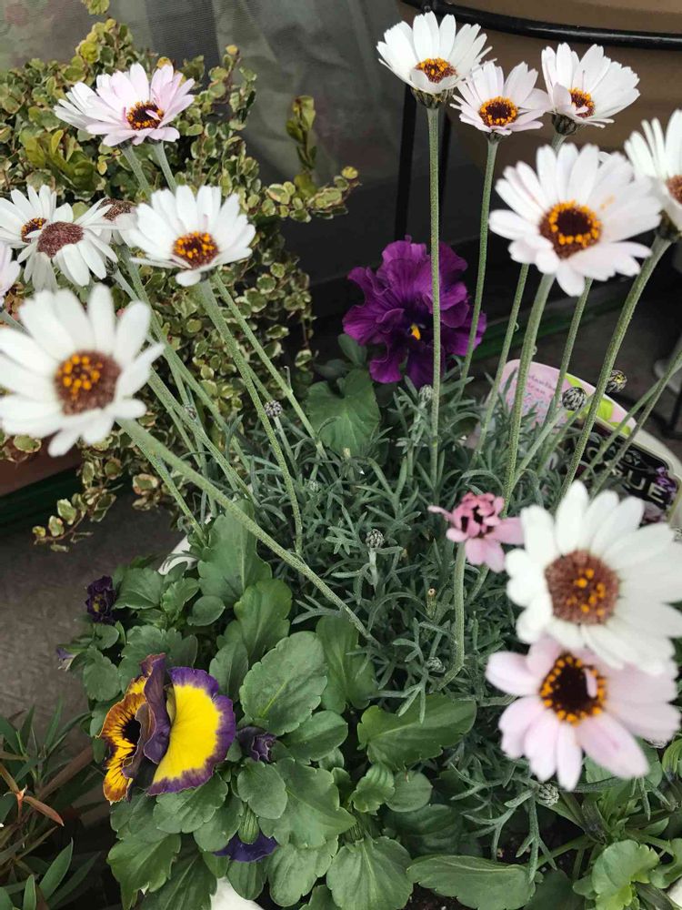 ローダンセマムの間からフリルがかわいいパンジーが顔を出しました。花がついていない安売り品だからか、なかなか盛り上がらないな〜💦