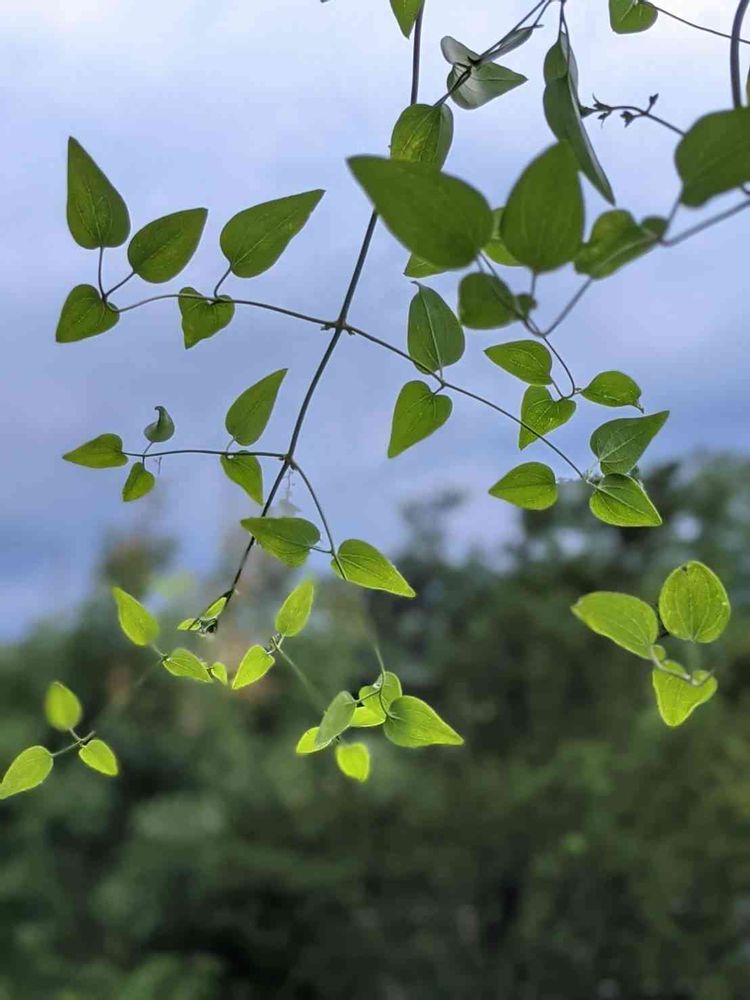 斜面突端の赤い木槿に奔放に巻き付いている仙人草が夕方の空をバックに垂れ下がっています。今日は久し振りに突然の雷雨が無く、平穏な空でした。…蕾も沢山出来ています。
