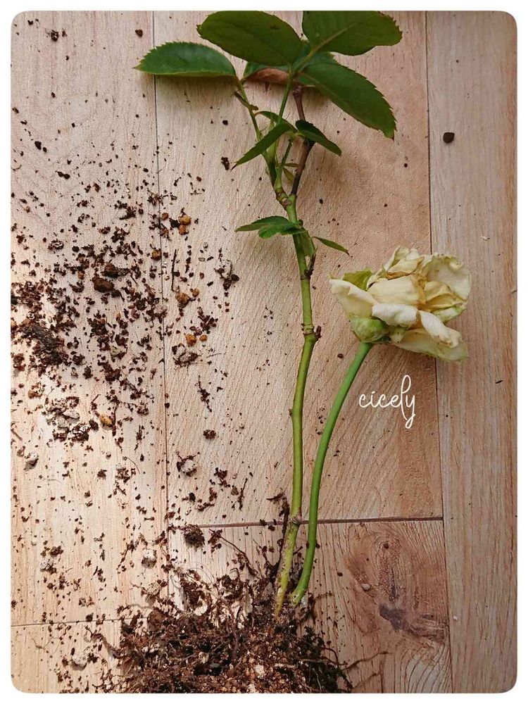 今朝投稿したバラだった子。帰ってきて掘り起こしたら、ちゃんと土の中で繋がっていました。まさかこんな育ちかたをするとは…。この挿し木に釣り合わないサイズの花ですね。