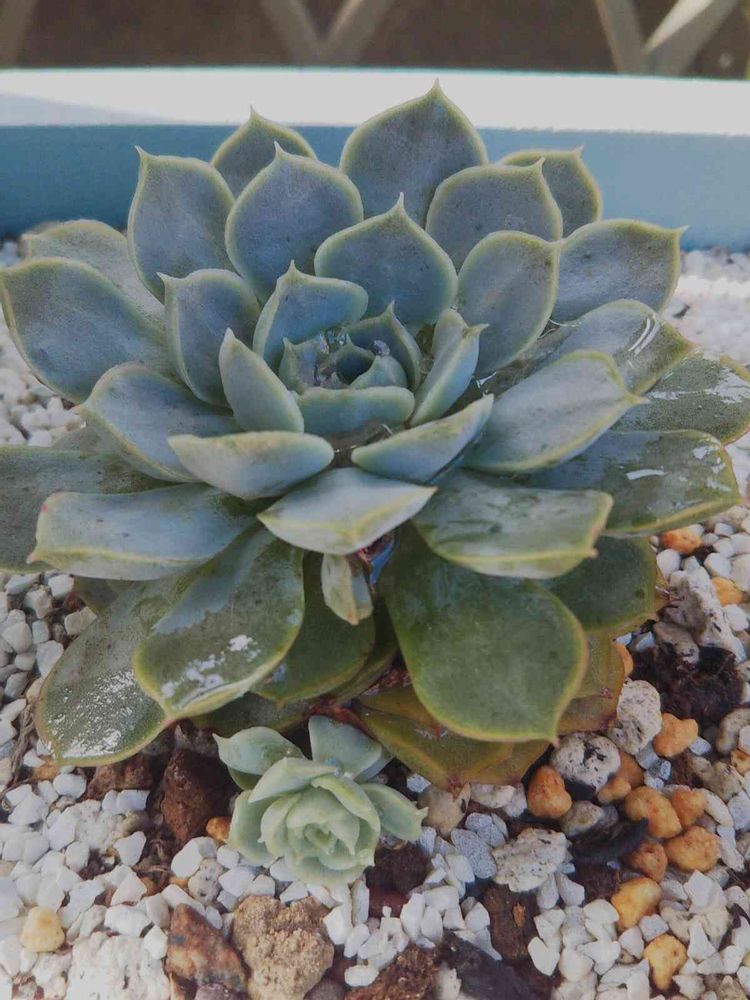 白いフェンスの台に載せた、多肉さんのシャルルローズに子株がひょっこり出てきました。写真には写っていませんが、もう1つ出てきています。