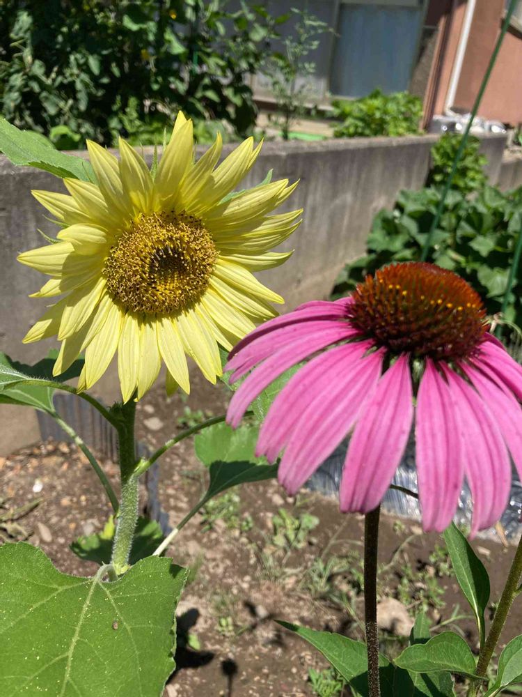 ひまわりさんがエキナセアさんに話しかけているみたいです(^^)