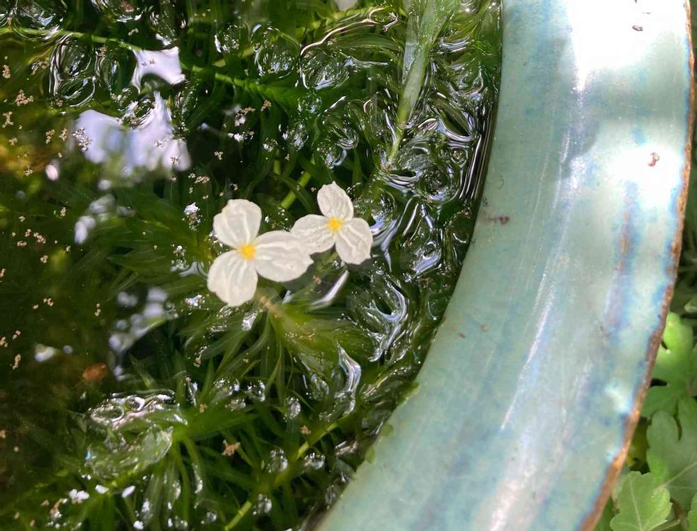 知り合いから頂いた水草に花が咲きました‼️実は卵も付いて来て、金魚が孵りました‼️3度目の感激です❣️