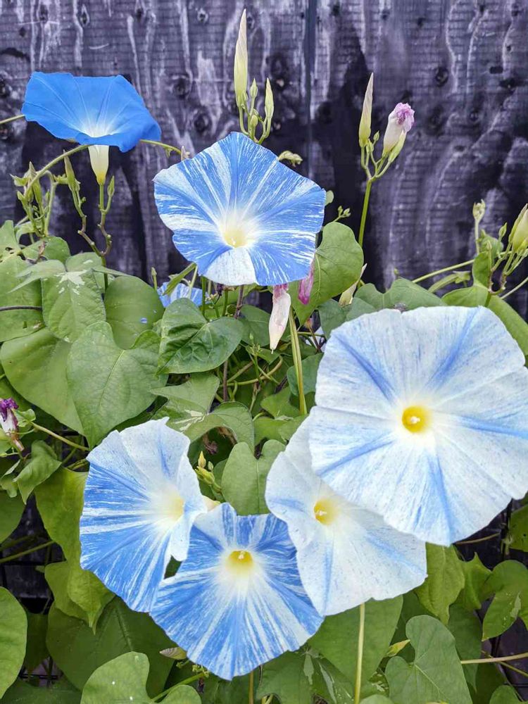西洋アサガオなので成長がいいです。私がまいたのは線が少なく遠目には白い花に見えます💦