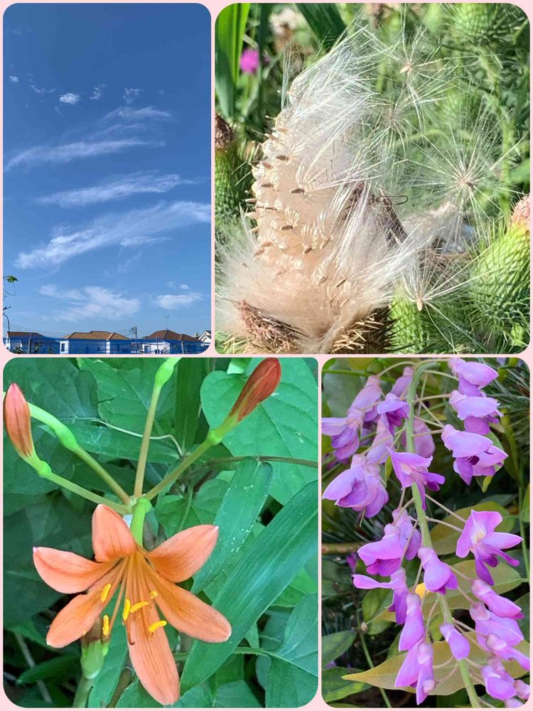 💐:上右、アザミ(薊)、花言葉の「独立」より花後の種子が羽をプロペラに変え青空(大空)に向かって旅立つ姿を表現しました♪♬🎶😊