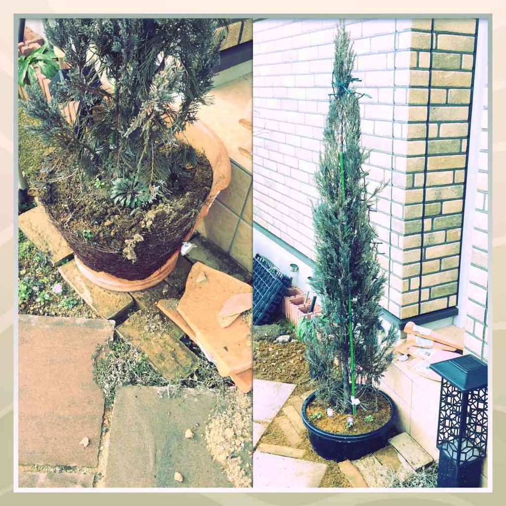 玄関先の鉢植えコニファーが強風で倒れて、ついに割れてしまったので、