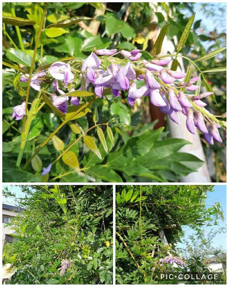 こんばんは😃🌃夕方、5時27分の、お多福ガーデンの、休憩所の、藤棚に、今頃、藤を、種から育てて4年前、ガーデンに、40センチ位に、育てたのを、移植しましたが、なかなか、今年も花は、咲かないので、諦めてましたら、花壇の、掃除を、してて、西側の、藤棚を、見上げたら、びっくり👀しました❗なんと!藤の花ではありませんか❗枝が、剪定された後の節の、辺りから、新芽みたいな所の、そばからちゃんと藤の花が、下がって咲いてました‼️不思議です😌💓今頃、咲くなんて、有りでしょうか?⁉️。