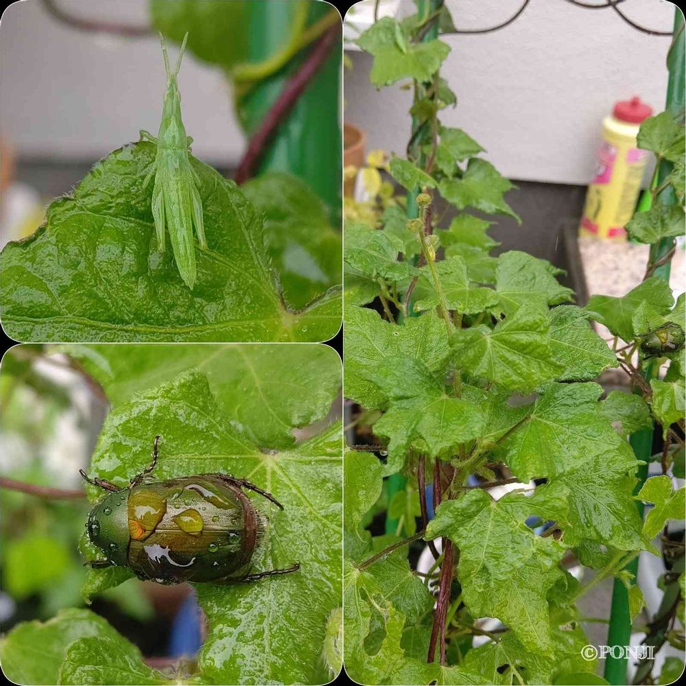 あっち行け!って言っても聞き耳持たないオンブバッタが、今日はコガネムシをお供に😁