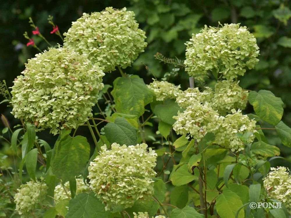 アメリカノリノキは北米原産のアジサイで、開花時期は日本のアジサイと同じ6~7月の梅雨です。