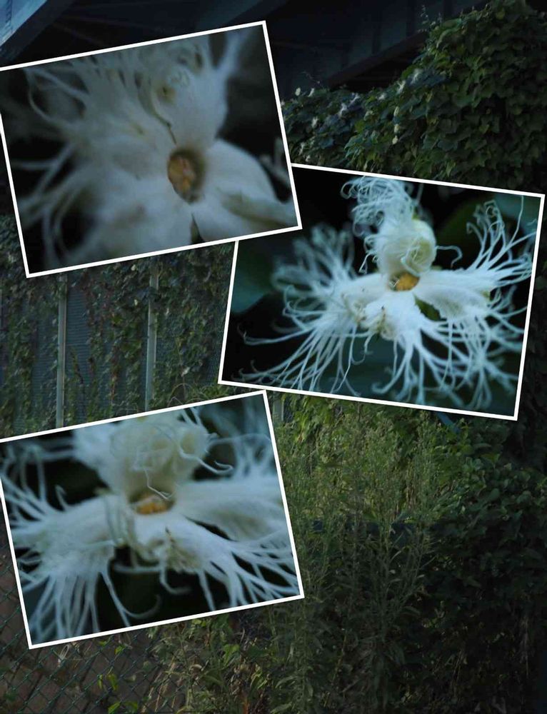 マンションのブロック塀のフェンスに沢山のカラスウリの花が咲いていた
