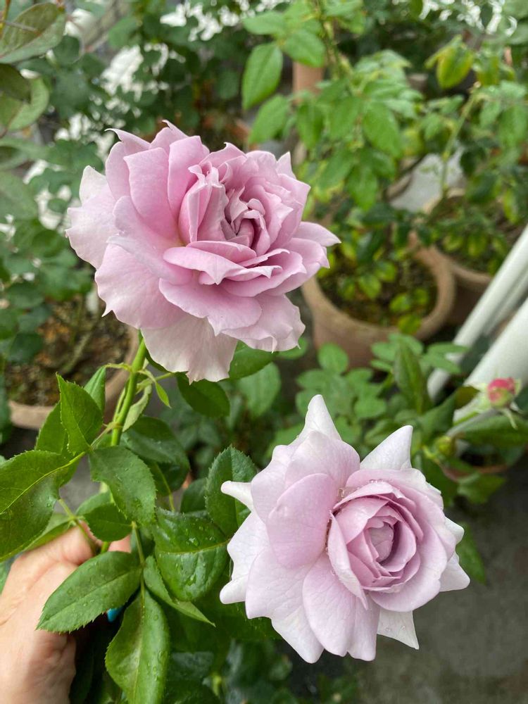 水遣りと咲き始める蕾をチェック、そして、昨日咲き始めたノヴァーリスとブルーバューは今日の酷暑で萎れる前にお家の中へ😊