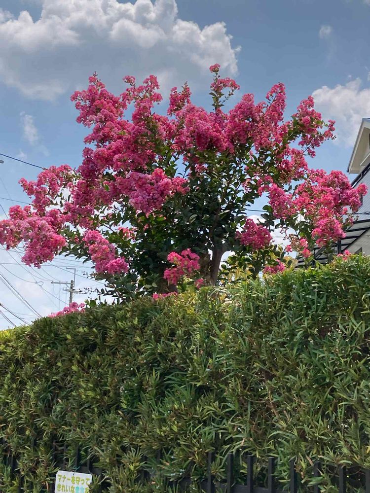 青空とピンクのサルスベリです。緑の生垣より高く育ってます。
