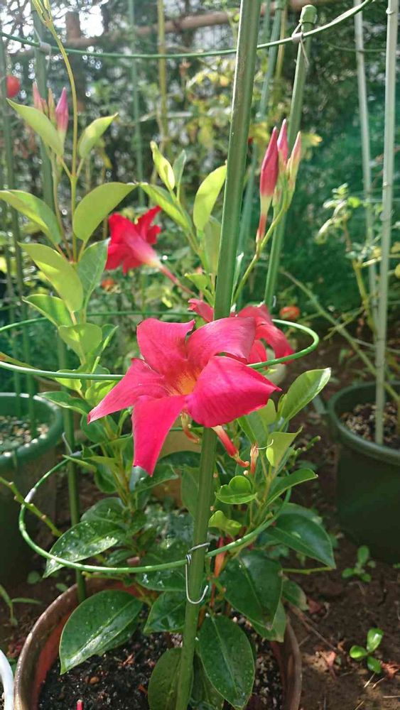 鉢が小さいのか、支柱の中でなんとか収まっていて、たまに軌道修正するくらいです😅エントランスの鉢は支柱をまだたててないので、うろうろしてます。