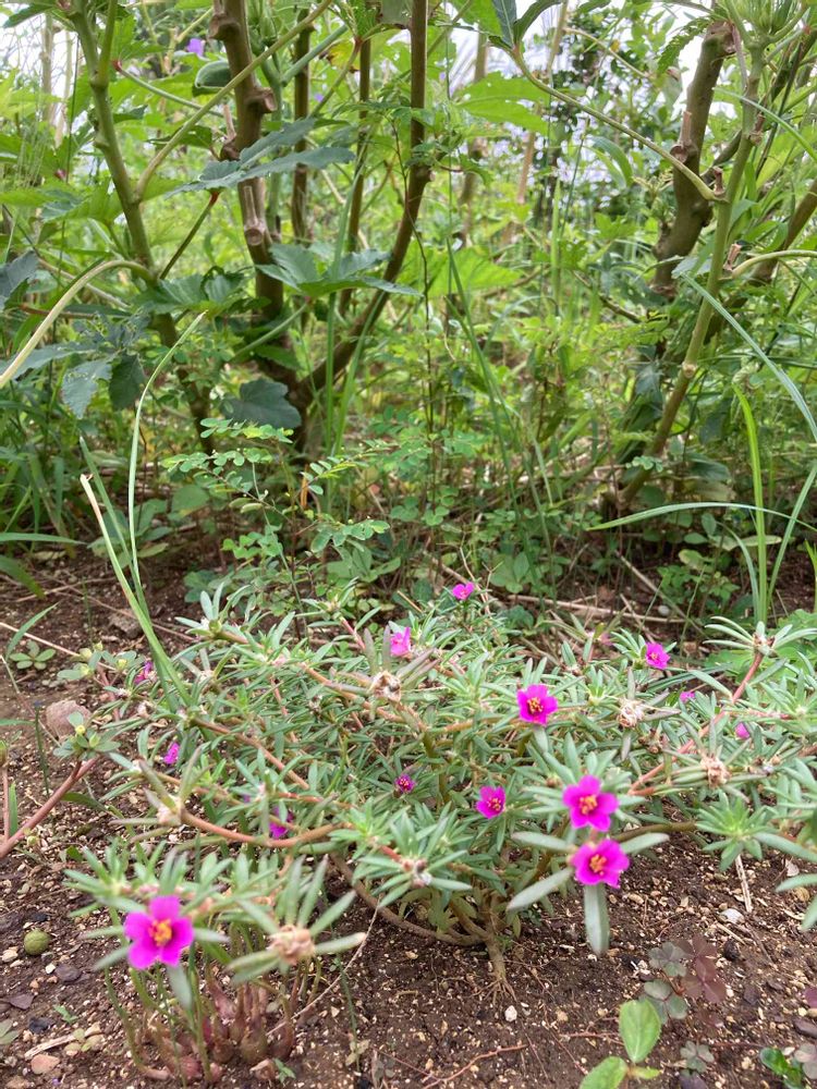 オクラの根元で綺麗に咲いてるヒメマツバボタン🌸