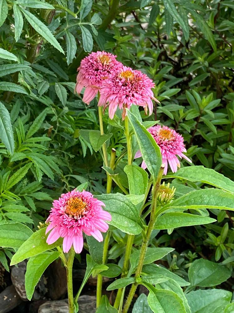 うちでは唯一のふさふさ系エキナセアです。小さいし、ひょろひょろしているのは周りのアフリカンマリーゴールドさんたちの圧に負けてるから?でも、南からの日差しはばんばん浴びてるけどなー。