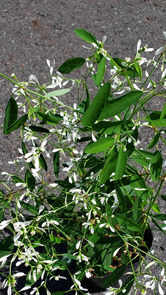 非耐寒性の低木。夏の暑さに強く、4月~11月頃に白い繊細な小花を次々と咲かせます。花に見える部分は苞(ほう)と呼ばれる花のすぐ下の葉で、本当の花は目立ちません。低木でありながら寒さに弱いので一年草扱いされていることが多いですが、暖地では屋外で冬越しできることもあります。真夏の高温期には、半日陰になるくらいの場所で管理すると状態良く育ちます。茎を切ると白い液が出るので、触ったときはすぐに手を洗いましょう。かぶれやすい人はビニール手袋などをして作業します。