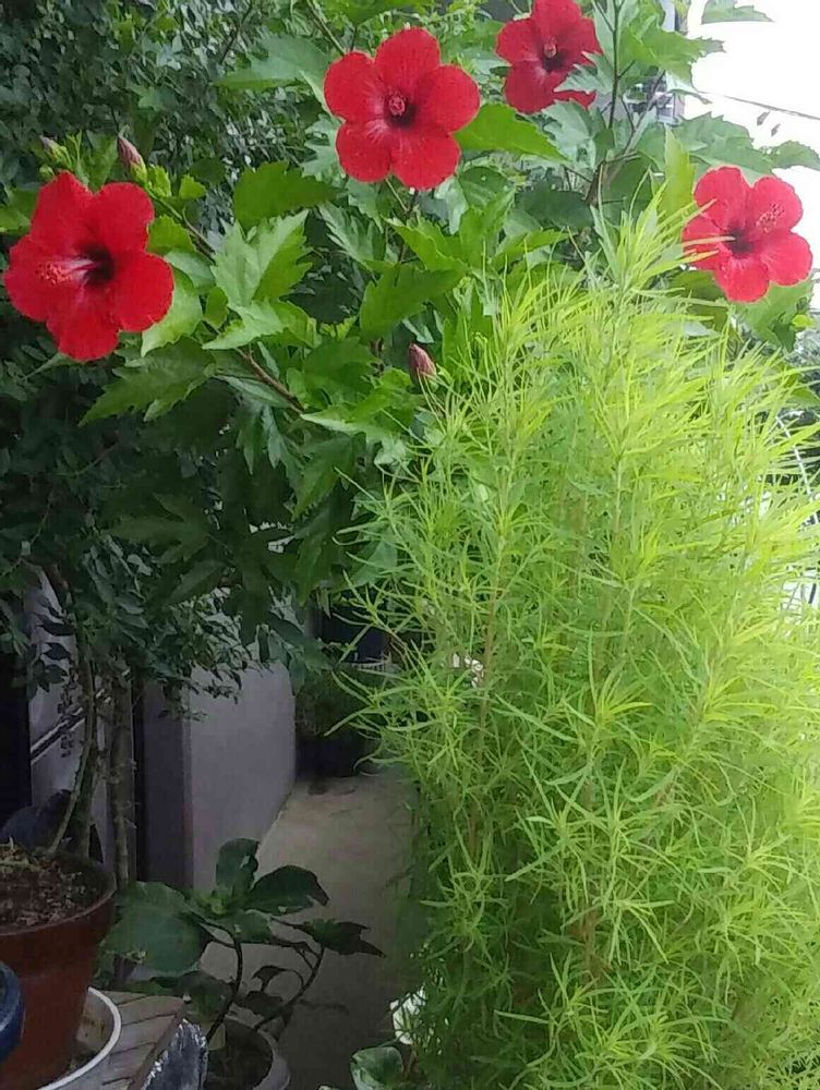 ハイビスカスとコキア、綺麗な緑に、赤い花が美しいです💚💚💚💕❤️💕💚💚💚