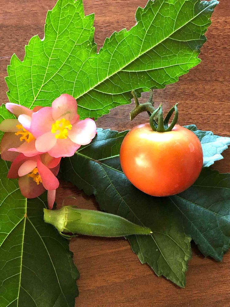 🍅立派ですね☺オクラもふくよか🎵ベゴニアさんも優しい色で映えますね🎶