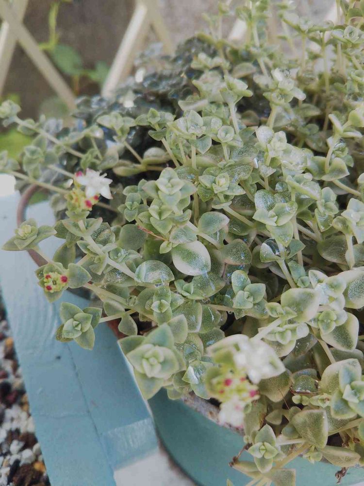 白いフェンスの棚に飾っているクラッスラ・リトルミッシーに小さな白い花が咲いています。セダムは緑の葉が増えていく植物だと思っていたので、花を咲かせる姿がとても可愛いです🍀☺️🍀