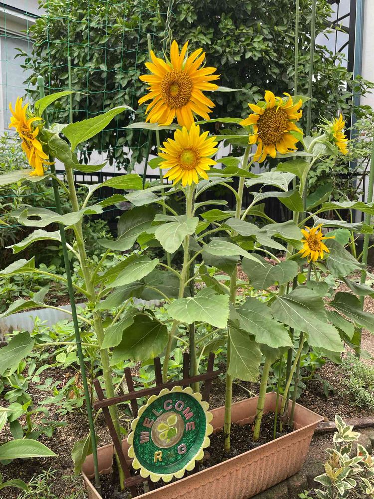 庭のミニ畑で種から育てた🌻やっと咲き揃いました。