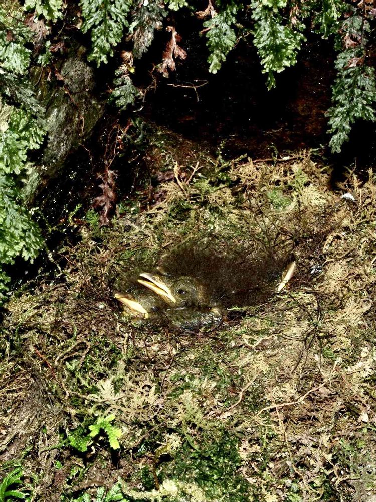 ミソサザイがこんな岩場にコケなんかで巣を作るって、どこかに書いてあったのでそうかもと思っただけで、なんの雛か分かりません。😅