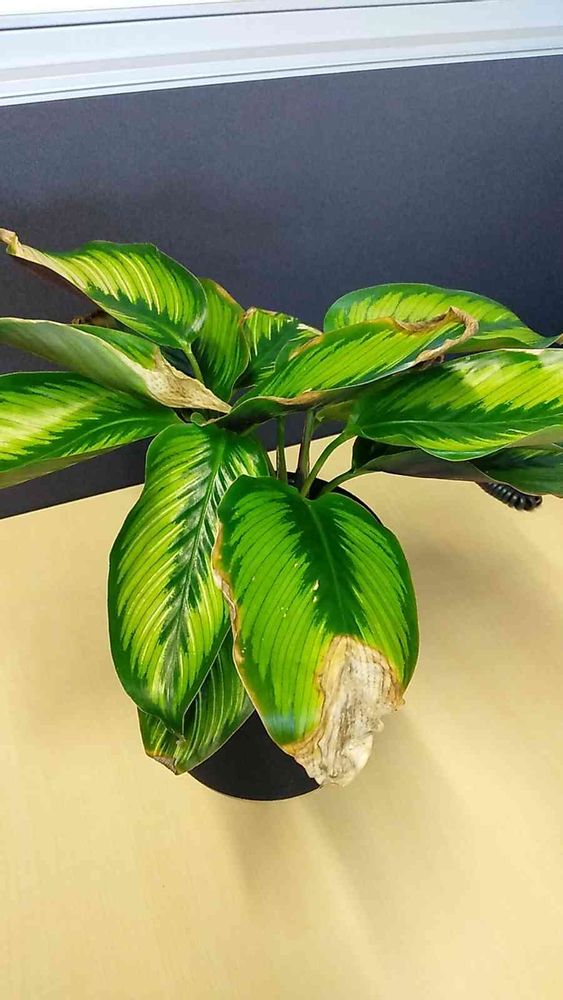 一ヶ月前ぐらいに購入したカラテアビューティースターが、購入時より元気がなく、葉っぱが一部枯れてきたり、端から巻いてきています。水やりはお店で聞いた通りやり、肥料をやったりしていますが、このような状態です。室内で直射日光の当たらない場所に常に置いています。何かいい方法があれば教えて下さい!