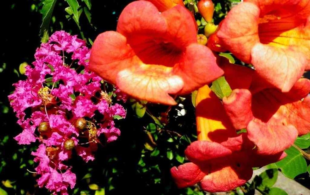 小さな庭のノウゼンカズラとサルスベリが饗宴(競演?)していました。