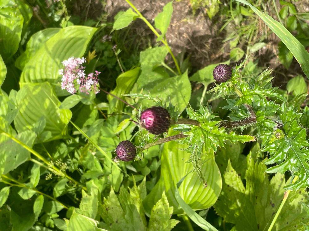 2つの花があります。白ピンクの花とあざみらしい花です。