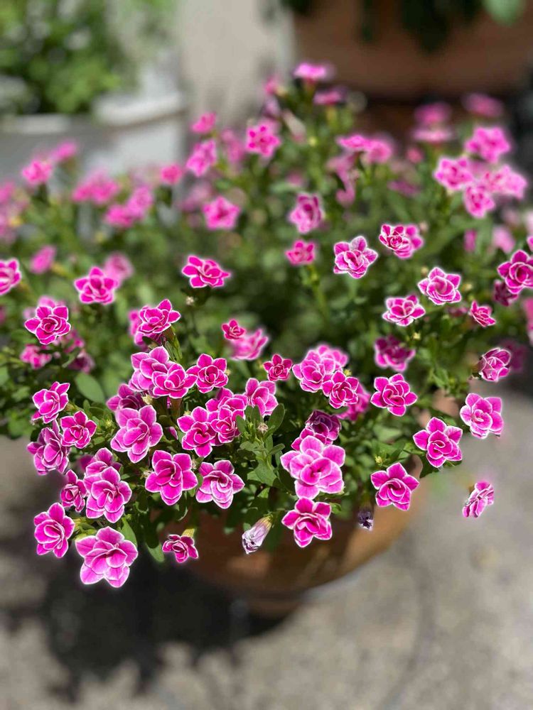 切り戻ししたスーパーベルダブルピンクリップルが咲いてきました🥰白い縁取りが可愛い💕でも真ん中が割れ、枝もまとまりが悪い😫また切り戻しかな〜💦挿し芽で増えたら今度は3株植えにしよう😌