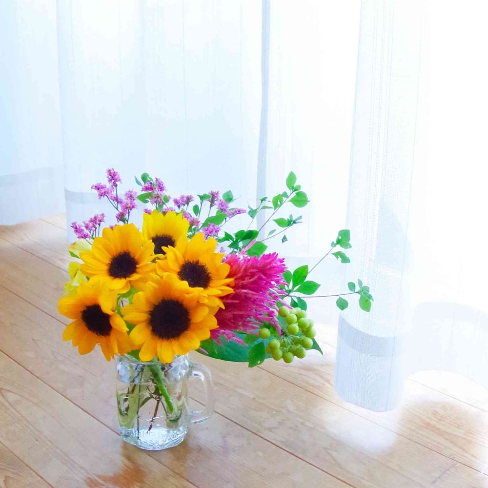 この時期なかなか生花が長持ちしませんが、それでも暑さに強いお花たちを可愛い組み合わせで送ってくれるので嬉しいです😊