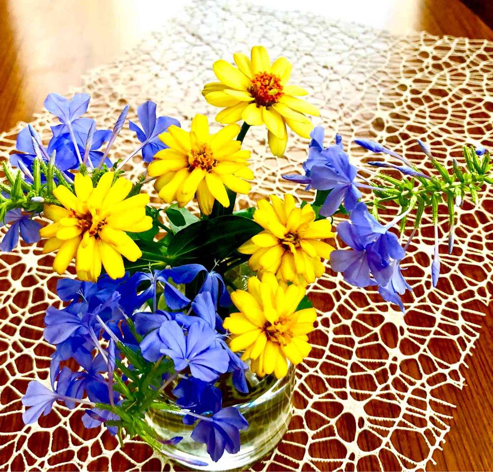 ジニアを切り取ったので同じくベランダに咲いていたルリマツリを合わせました。