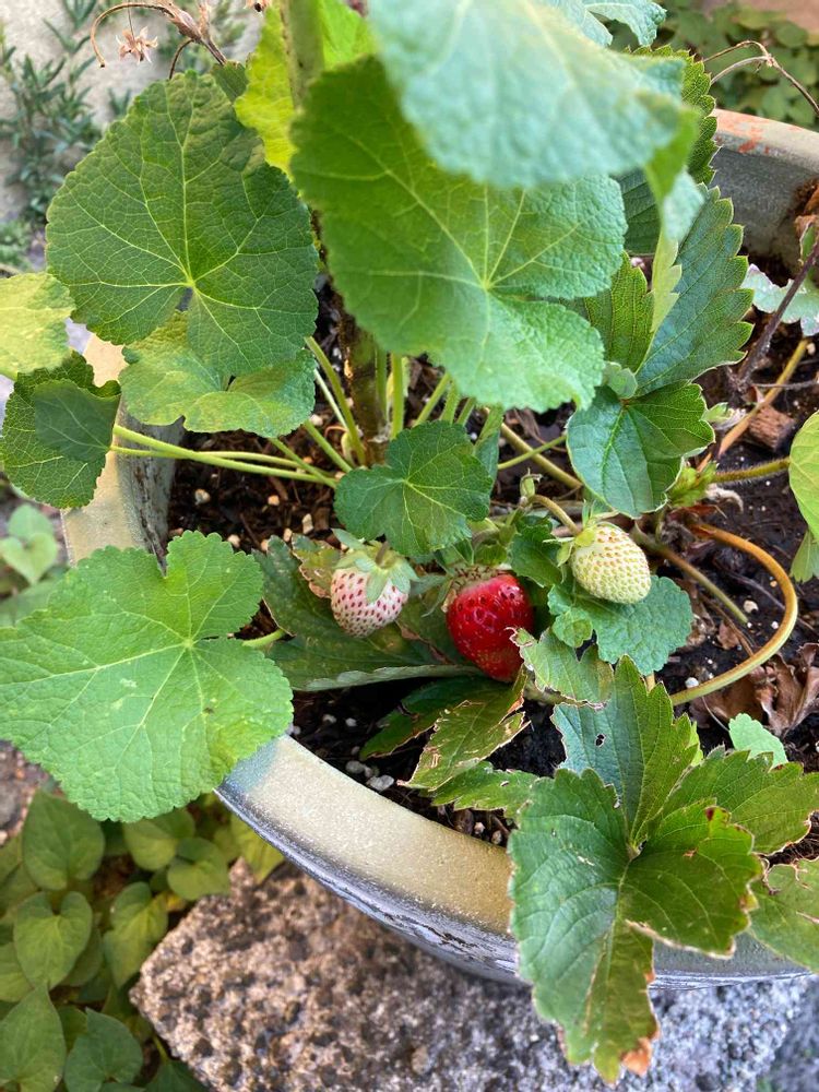 今朝のもう1枚。いつぞやの鉢に真っ赤ないちごが!いつもキョロキョロしているわたしは怪しい人でしょうか(笑)