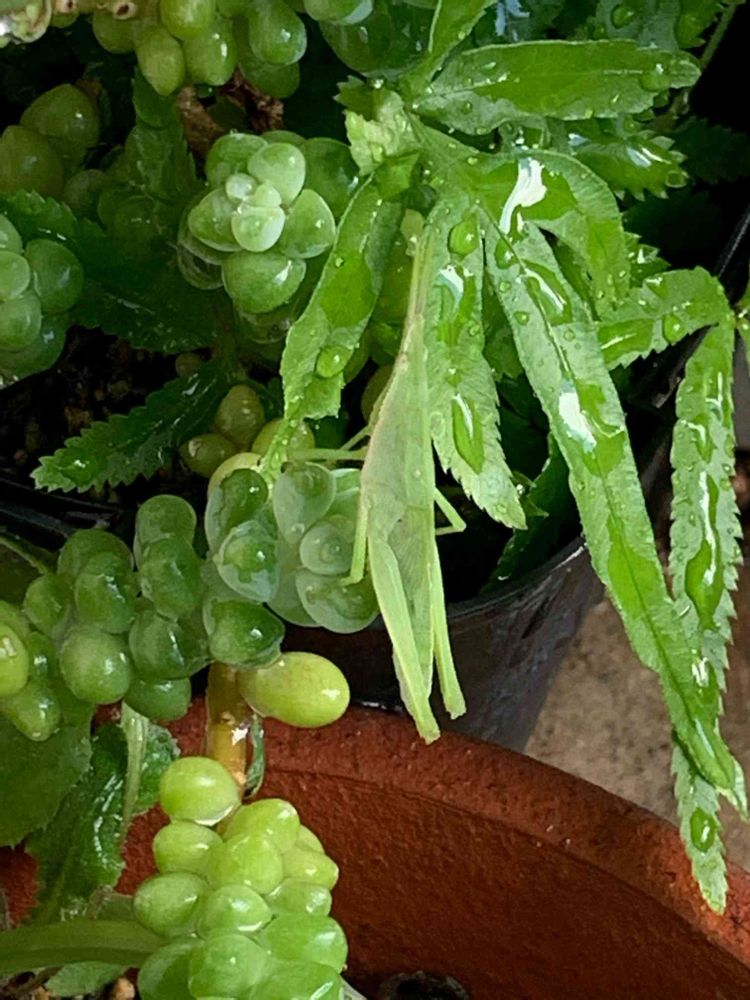 ポロポロ落ちて他の鉢で増えたビアホップにバッタさんがびょーんって飛び乗りました😚