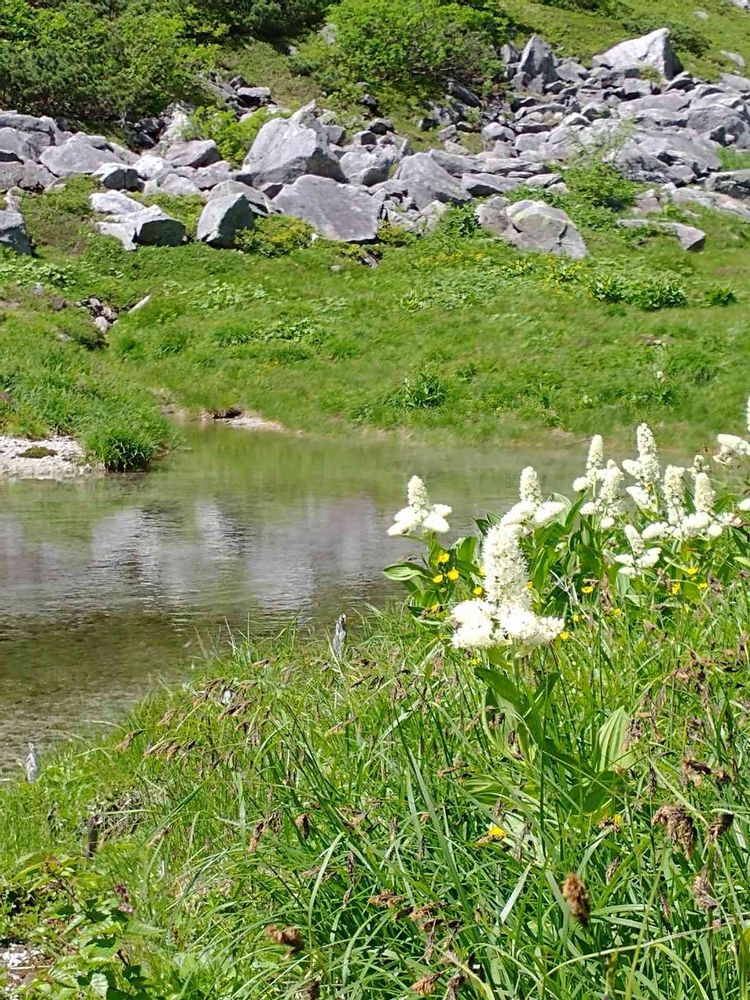 中央アルプス・千畳敷カール内 剣が池湿原に咲くコバイケイソウの白い花🌼🌱と、ミヤマクロスゲ(かな?)
