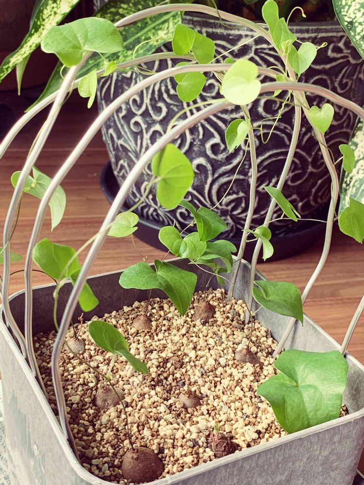 休眠させる気満々で、一つの鉢に芋を並べて植えていたので、アルミ線買ってきて、雑〜な感じに這わせてみました✌️