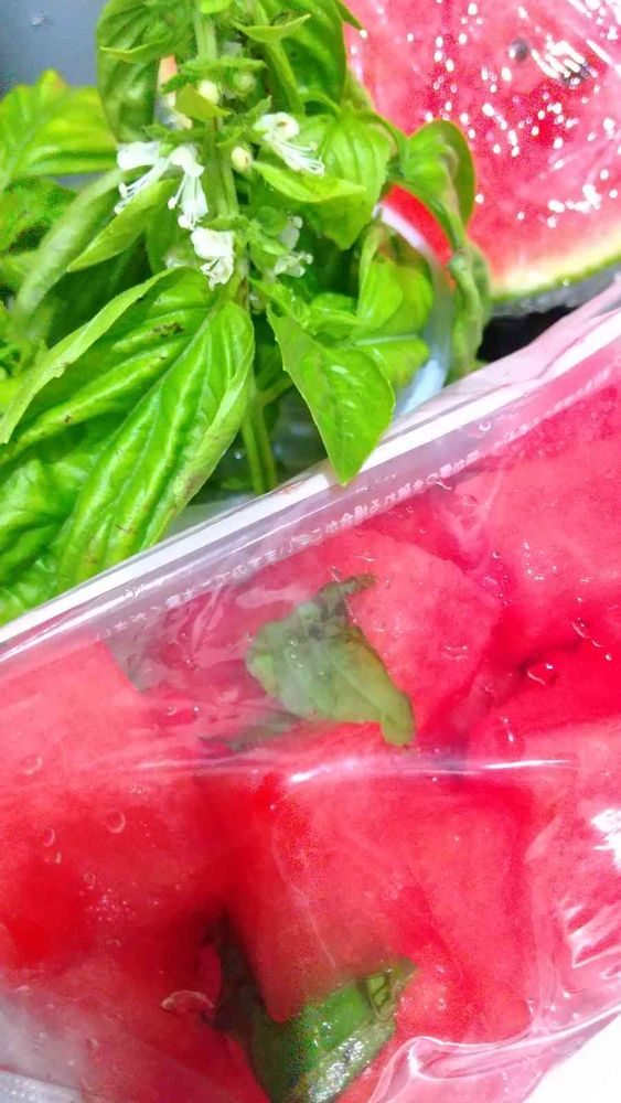① コンパニオンプランツとして栽培しているバジル数枚をちぎる。