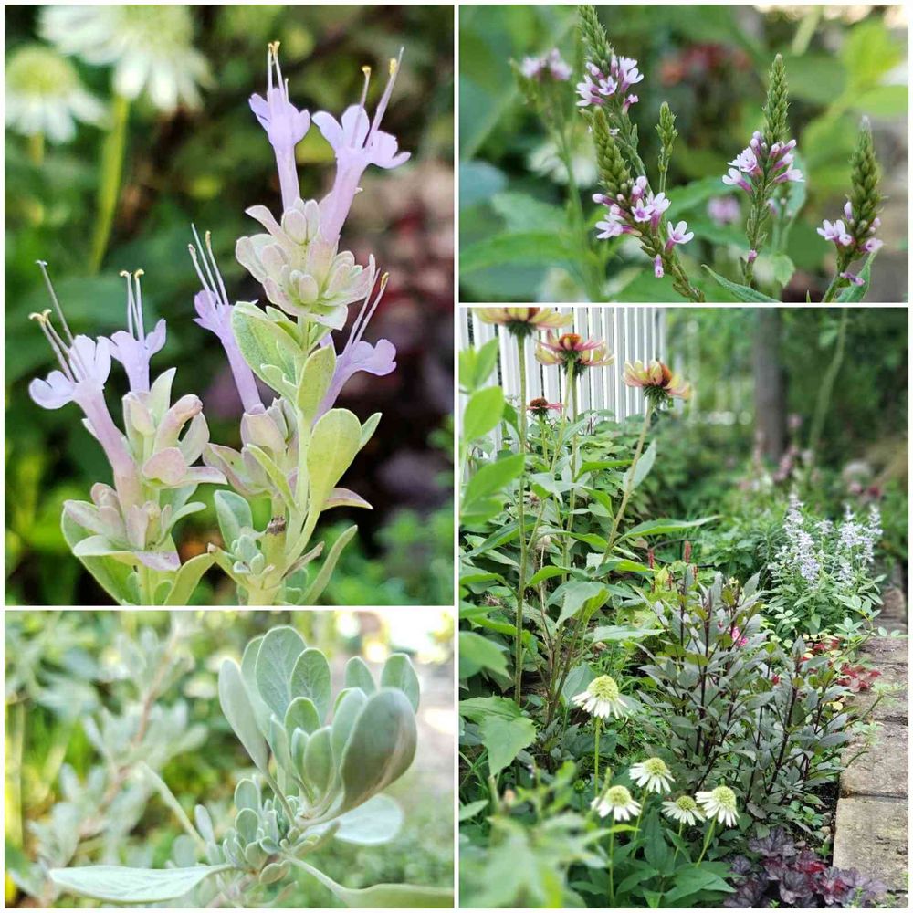 花壇の一番手前に昨年の冬に植えた、シルバーリーフのサルビア パキフィラが咲き始めました(左の2枚)。