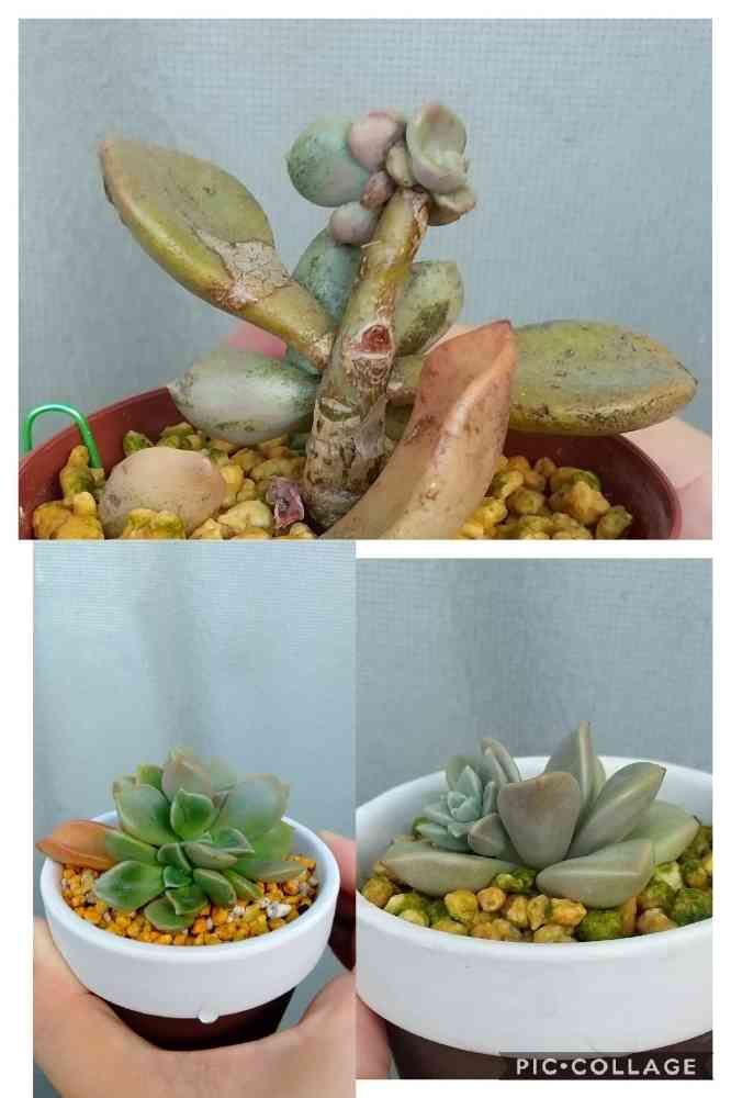 元々全部一つの株で、HCでかなり徒長したのを買ってきた子です。上が元株で右下がそこから外した子株、左下が葉挿し。