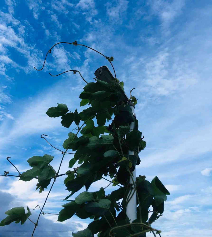 街灯に巻きつく葛の蔓の逞しさと、台風前の不安定な風によるコラボです。