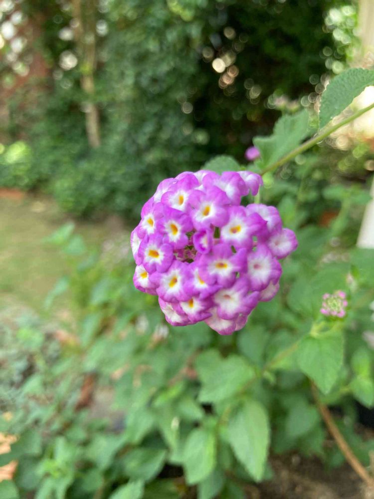 ランタナが、ポンポン咲いてます。長い枝を伸ばした先に咲いているので、一つをアップで。