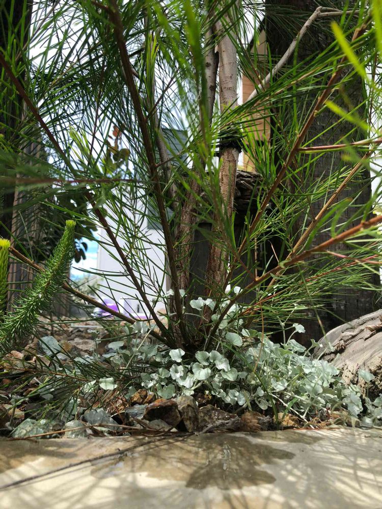 グランドカバーの植物の隙間からアカシアが枝出してる(*´ω`*)