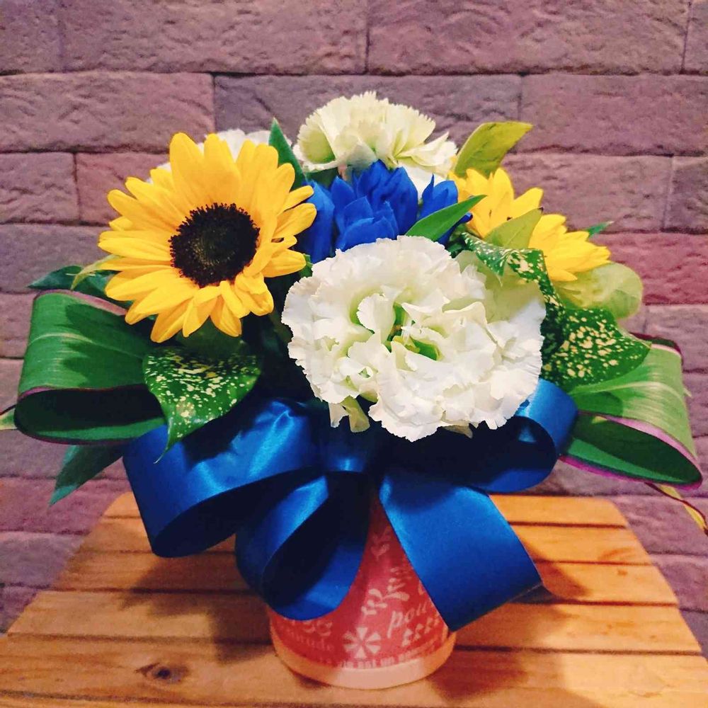 ヒマワリ・リンドウ・トルコキキョウ・カーネーション・ドラセナ・ゴッドセフィアナ