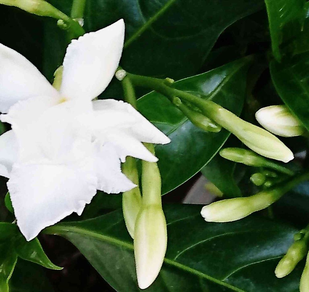 これね 最初 茉莉花かと思っていたのだけど(お花の大きさはそんな感じです)どうも お花の形が違うので調べたら🔍「八重三友花」でした