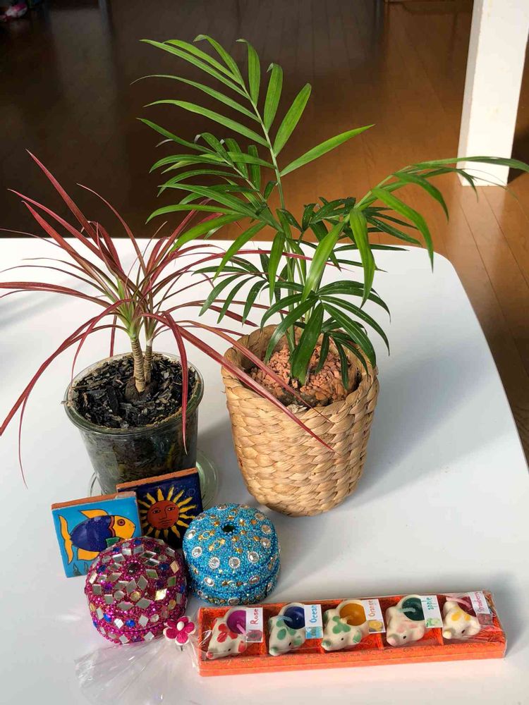 うちのテーブルサイズ南国系コンビ🏝です。前にも登場しましたが(^_^;)テーブルヤシの方は葉に時々白くカビの様なものがついてしまうので晴れた日には日光浴させたりしています。赤い方はドラセナ属 コンシンネ トリカラー レインボーです。ホントは大きいのが欲しいけど、スペースの関係で(^_^;)トホホ💧雑貨はマライカで買いました。使い道は考えず、綺麗なのでさっさとカゴへ😋