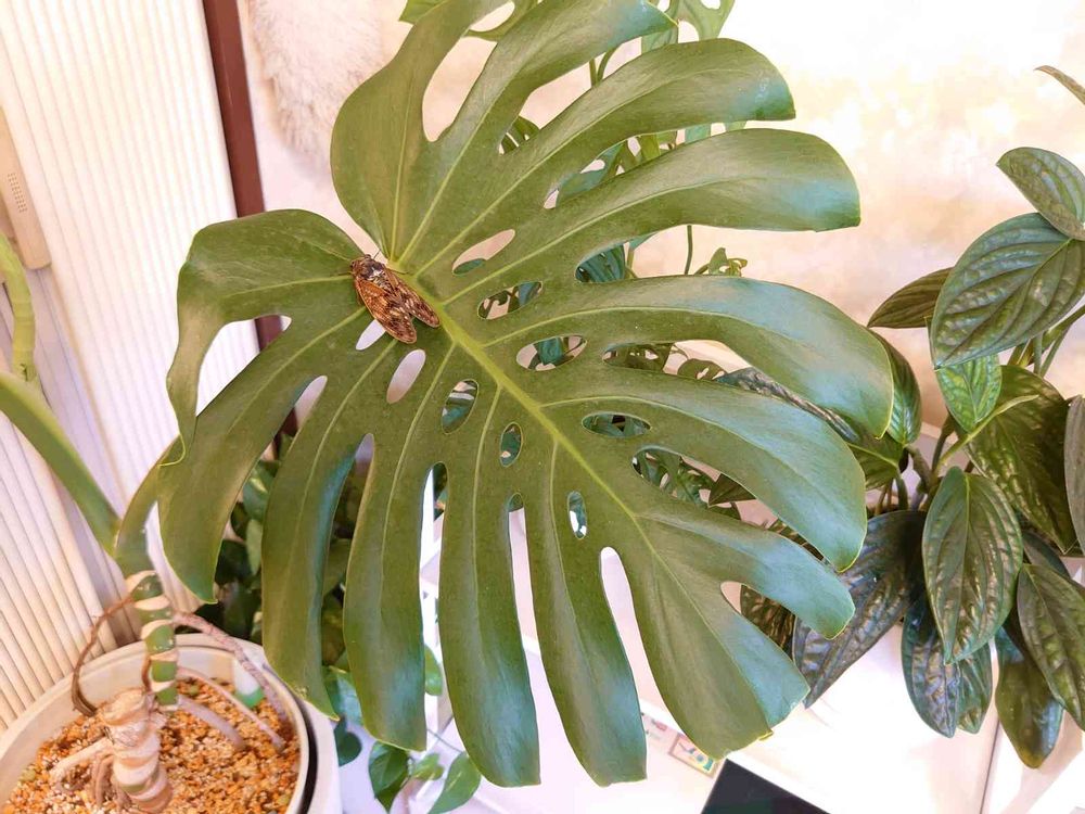 綺麗な状態でヴァルコニーで息絶えていたアブラゼミが居たので供養と思いデリキオサの葉に載せてみました。