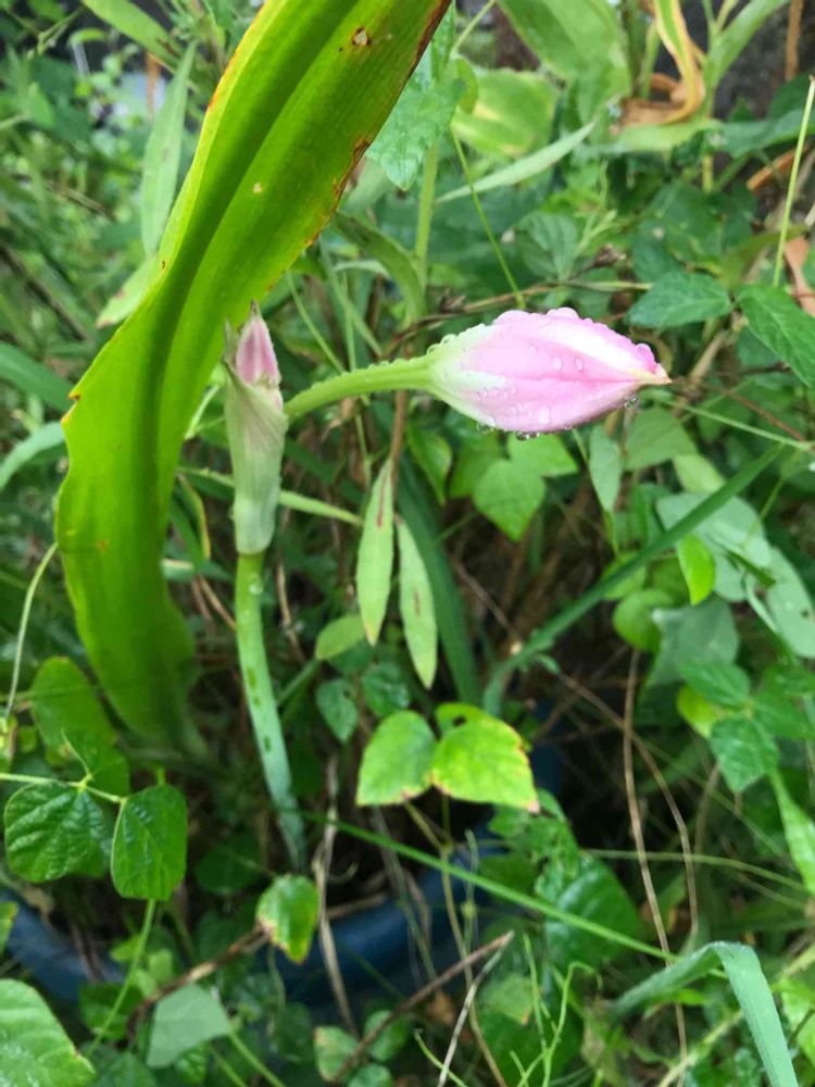 庭の忘れさられた鉢植えからピンク色の蕾が!