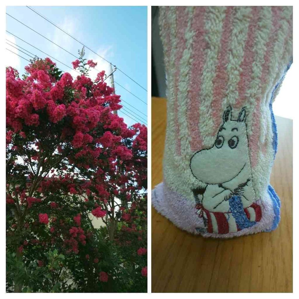 ムーミンママのエプロン🎽🍴縞の赤と百日紅の赤とコラボしました。